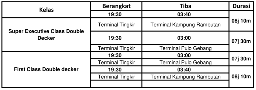 Executive Class merupakan kelas dengan konfigurasi seat 2-1 yang berada pada deck atas bus, pada kelas ini penumpang mendapatkan layanan berupa AC, Toilet, Selimut, Bantal, Snack, Wifi, Layanan Makan, Leg Rest, Android Entertainment System, USB Plug dan Layanan Pramugara/i.